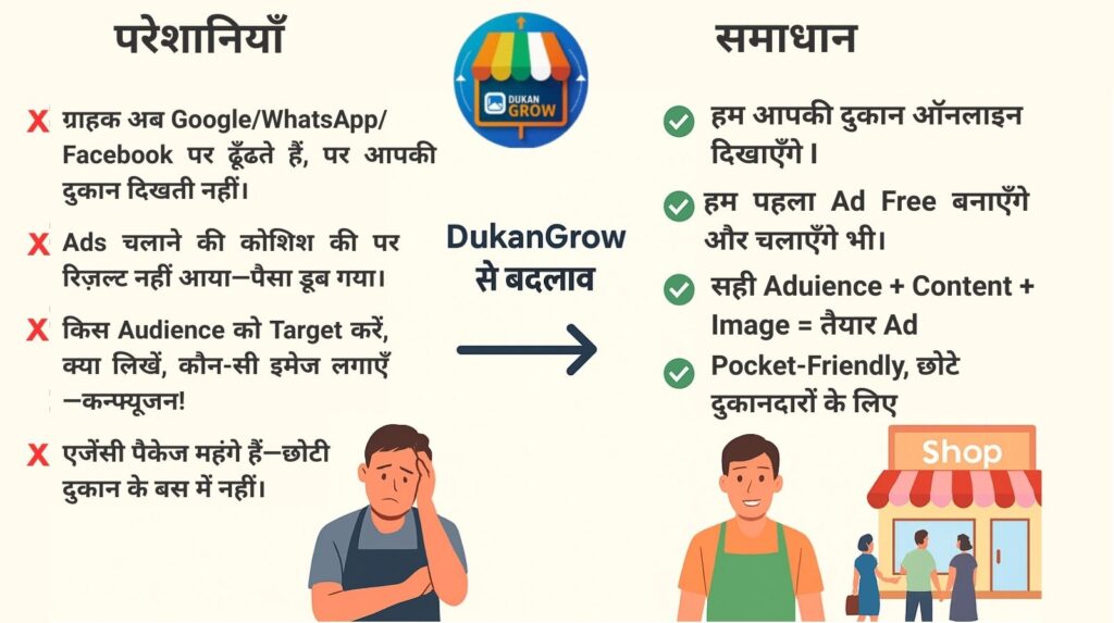“मैं एक छोटे जनरल स्टोर का मालिक हूँ और पहले सिर्फ मोहल्ले के ग्राहकों पर निर्भर था। लेकिन DukanGrow से जुड़ने के बाद मेरी दुकान की बिक्री 2 गुना बढ़ गई है। Facebook Ads और WhatsApp Marketing के जरिए अब आस-पास के नए ग्राहक भी मेरी दुकान तक पहुँचते हैं। सबसे अच्छी बात ये है कि पूरा सेटअप हिंदी में समझाया गया और मुझे तकनीक की ज्यादा जानकारी होने की ज़रूरत नहीं पड़ी। सच कहूँ तो, DukanGrow ने मेरी दुकान को सचमुच Smart Dukaan बना दिया है।”